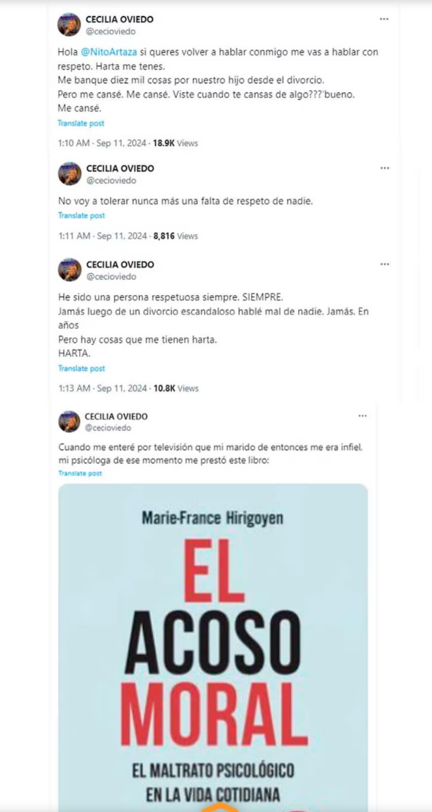 «HARTA ME TENES @NitoArtaza. HARTA. De tus mentiras, de tus infidelidades cuando estuvimos casados. De tu psicopateo hacia mi persona, que no era demasiado linda, que tenía celulitis, que era una inútil, que era fea, he recibido demasiado maltrato de tu parte. Harta. Me cansé», escribió en otro post. Y concluyó: «Todo lo que postee está avalado por mi abogada».