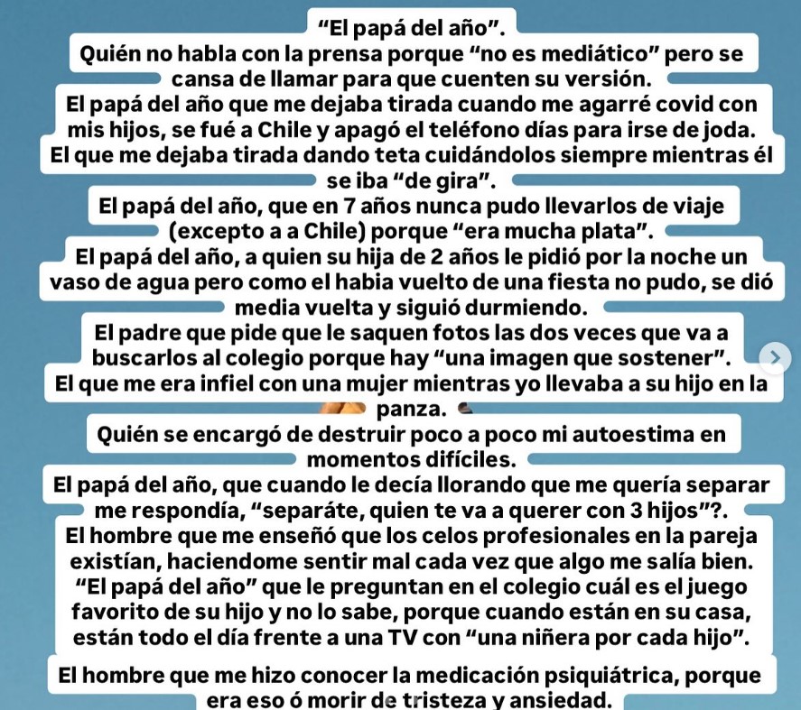Siguiendo con su descargo, la actriz aseguró que sufrió una infidelidad de parte del actor cuando estaba embarazada de Amancio. «Me era infiel con una mujer mientras yo llevaba a su hijo en la panza«, escribió. En ese sentido, remarcó que al finalizar su relación terminó con medicación. «Era eso o morir de tristeza y ansiedad».