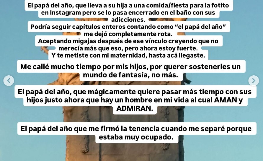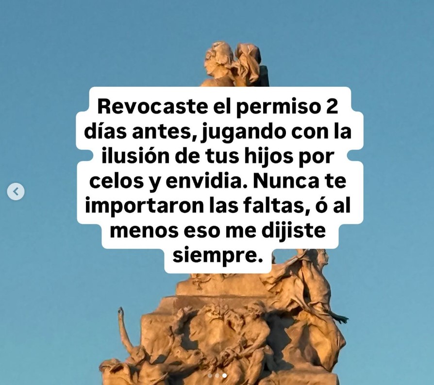 «Revocaste el permiso 2 días antes jugando con la ilusión de tus hijos por celos y envidia. Nunca te importaron las faltas o al menos eso me dijiste siempre”, finalizó.
