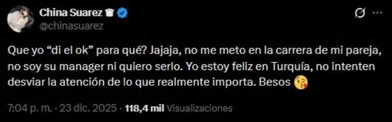 Todo comenzó cuando el periodista Gustavo Méndez aseguró que el presidente de River mantenía conversaciones con el delantero, mientras que Pablo Calvari, especializado en la actualidad del club, afirmó que Icardi estaría dispuesto a resignar parte de su salario y que contaría con el aval de su pareja. Ante esto, la China fue contundente y escribió: “¿Que yo ‘di el ok’ para qué? Jajaja, no me meto en la carrera de mi pareja, no soy su mánager ni quiero serlo”, una frase que muchos leyeron como una indirecta a la conductora de MasterChef Celebrity, quien en el pasado se adjudicó decisiones clave en la carrera del futbolista.