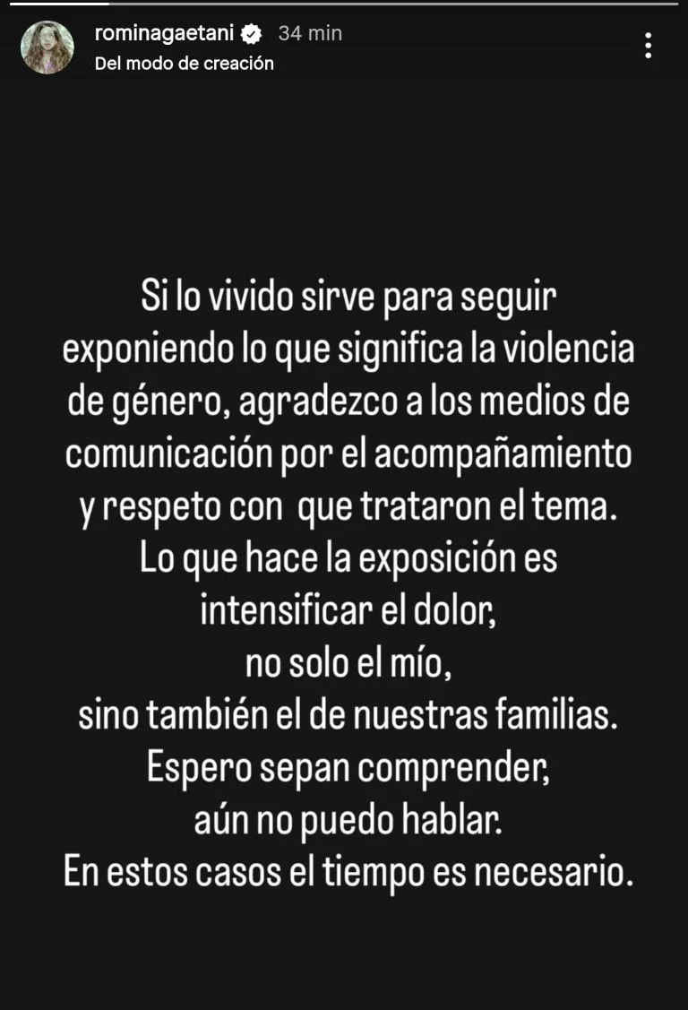 En su cuenta de Instagram, Gaetani explicó los motivos de su silencio mediático y agradeció el trato recibido: «Si lo vivido sirve para seguir exponiendo lo que significa la violencia de género, agradezco a los medios de comunicación por el acompañamiento y respeto con el que trataron el tema», escribió. Desde que el caso se hizo público, la actriz optó por resguardarse emocionalmente, delegando las declaraciones formales en su abogado, una decisión que, según expresó, busca cuidar tanto su dolor como el de su entorno más cercano.