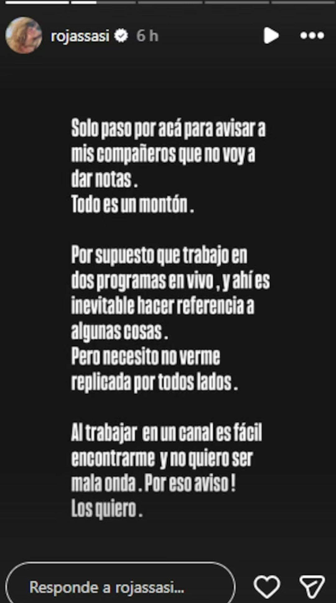 «Por supuesto que trabajo en dos programas en vivo, y ahí es inevitable hacer referencia a algunas cosas. Pero necesito no verme replicada por todos lados”, agregó. «Al trabajar en un canal es fácil encontrarme y no quiero ser mala onda. Por eso, aviso. Los quiero«, cerró la modelo contundente.