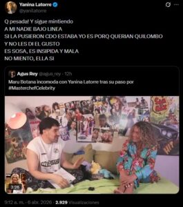 Sin embargo, más allá de ese episodio puntual, Botana no ocultó su malestar. “ mí me molesta la mentira. Todo lo que dice es súper mentira”, lanzó sin filtro, y cuestionó la forma en la que se construyen ciertos conflictos mediáticos. Incluso reveló que intentó acercarse a Latorre fuera de cámara para bajar la tensión, pero no tuvo respuesta: “La encaré para saludarla y no me dio ni bola”.