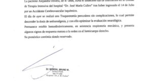 Asimismo, destacaron que la paciente «permanece estable hemodinámicamente» y que respira por asistencia mecánica. En ese contexto, «presenta algunos signos de respuesta motora a la orden en el hemicuerpo derecho». Pese a su mejoría, el pronóstico continúa siendo reservado.