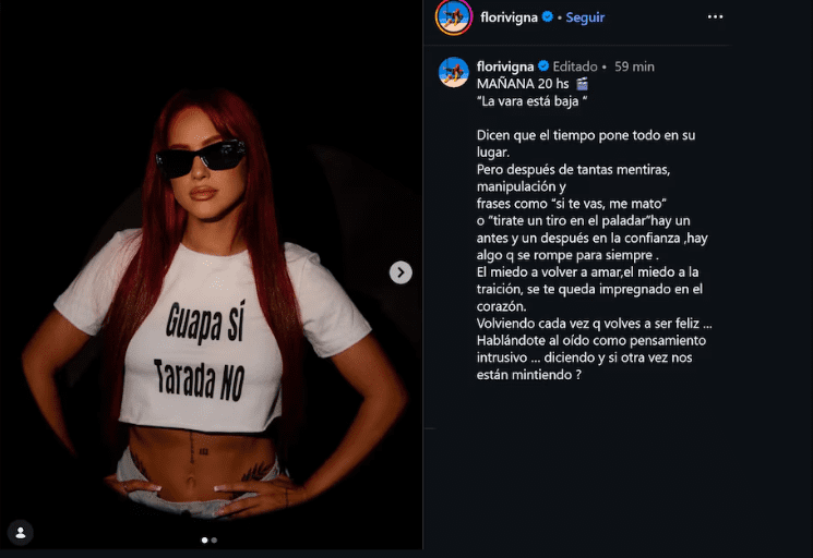 Lejos de quedarse solo en la denuncia emocional, la intérprete también apostó por un mensaje de superación. “Con el tiempo entendí que sanar no es callar y listo… Alquimizar el dolor. Transformarlo en aprendizaje”, reflexionó, subrayando su proceso de crecimiento. Como broche simbólico, lució una remera con la frase “Guapa sí, tarada no”, un guiño que muchos leyeron como una declaración de principios. Así, Flor Vigna convierte su historia personal en inspiración musical y vuelve a marcar distancia de Castro con un mensaje tan íntimo como contundente.
