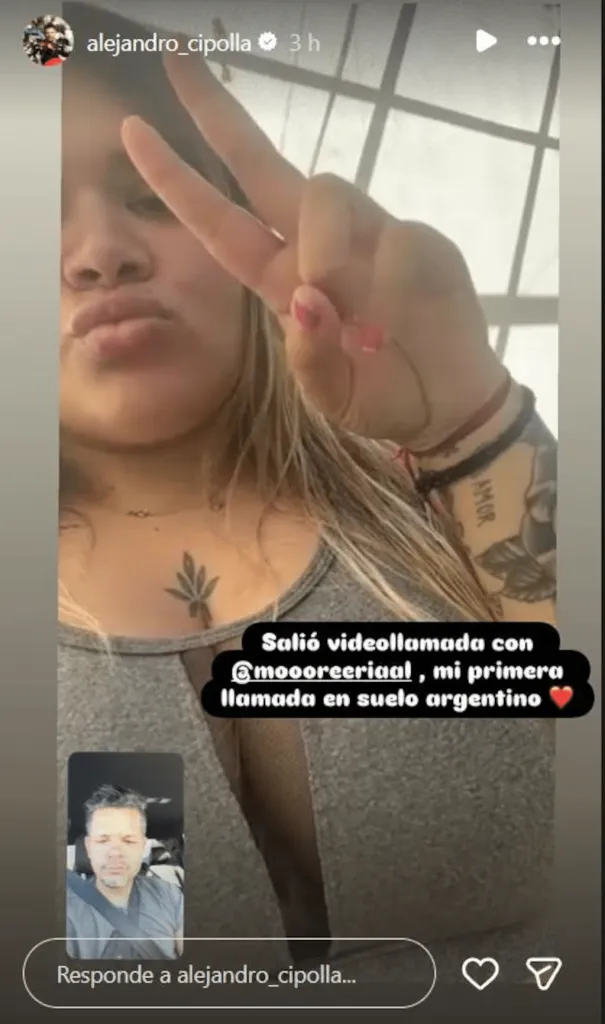 La fotografía fue compartida por su amigo y exabogado, Alejandro Cipolla, luego de mantener una videollamada con ella. “Salió videollamada con More Rial. Mi primera llamada en suelo argentino”, escribió junto a la captura. En la imagen, Morena aparece sonriente y haciendo el gesto de “amor y paz”. Sin embargo, dos detalles despertaron especulaciones: una cinta roja atada en su muñeca —vinculada popularmente a la protección contra energías negativas— y el espacio desde donde se comunicó, que no parecería corresponder al pabellón común del penal.
