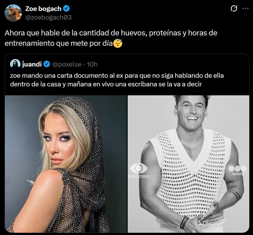«Zoe mando una carta documento al ex para que no siga hablando de ella dentro de la casa y mañana en vivo una escribana se la va a decir«, escribió el usuario @poxelse en la red social X. Acto seguido, fue la exGH quien confirmó la noticia. «Ahora que hable de la cantidad de huevos, proteínas y horas de entrenamiento que mete por día«, escribió burlándose de su ex. La noticia la recibirá Manuel Ibero este jueves 25 de febrero en el debate.