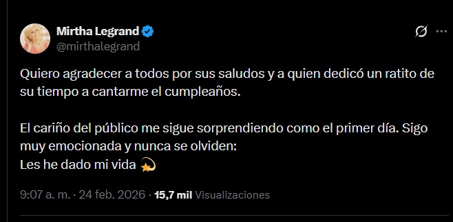 Luego del festejo, Mirtha hizo público un mensaje en el que expresó su gratitud por las innumerables muestras de cariño recibidas. “Quiero agradecer a todos por sus saludos y a quien dedicó un ratito de su tiempo a cantarme el cumpleaños”, manifestó conmovida.