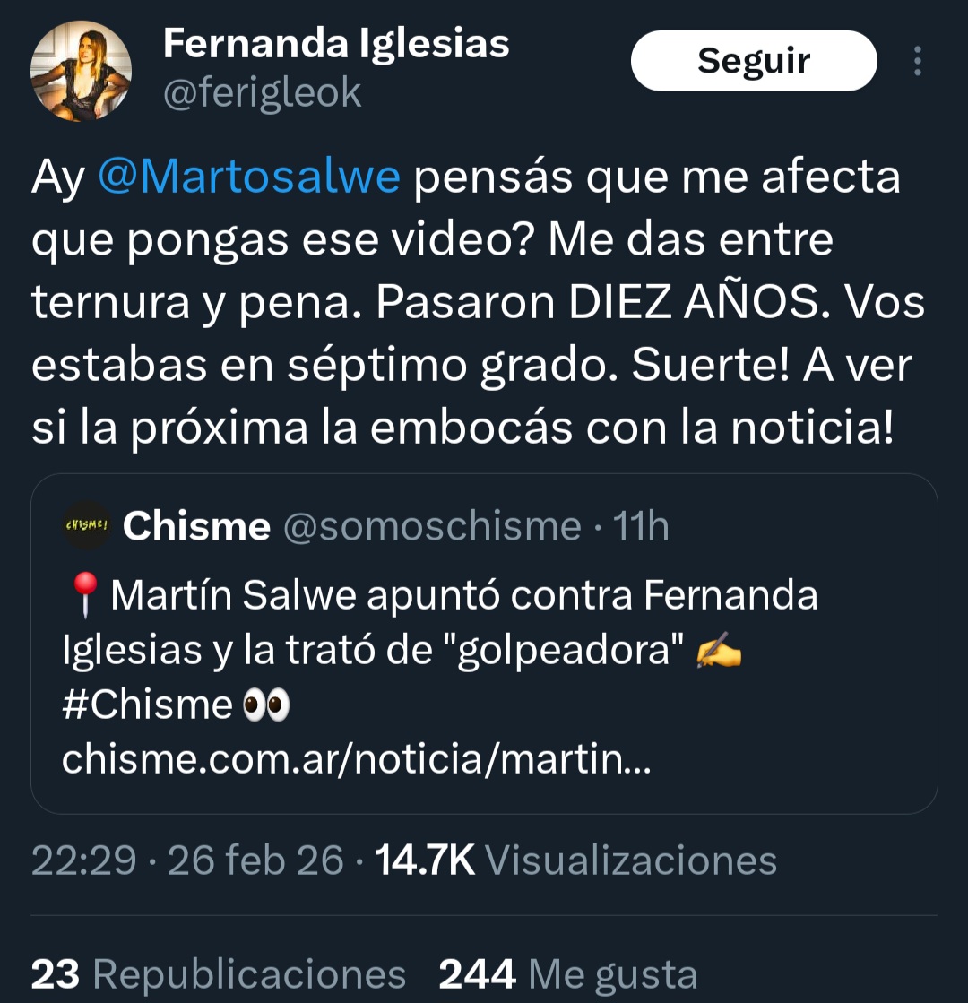 Nuevamente, la periodista recogió el guante y le dedicó un tuit en la misma red social. «Ay Martín Salwe pensás que me afecta que pongas ese video? Me das entre ternura y pena. Pasaron DIEZ AÑOS. Vos estabas en séptimo grado. ¡Suerte! A ver si la próxima la embocás con la noticia», escribió arrobando al panelista. ¿Qué responderá?