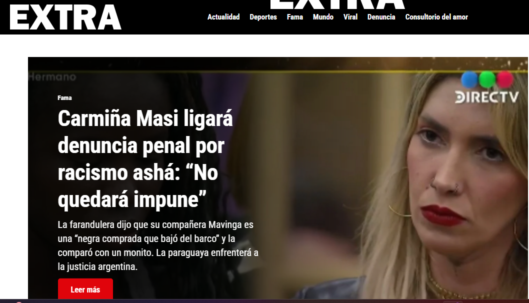 Dos medios locales, fue el medio digital “extra” que publicó la denuncia que le hará la familia de Jenny Mavinga. “Carmiña Masi ligará una denuncia penal por racismo ashá. No quedará impune”. En la nota revela el giro que hará Marcos Viveros, el novio de Carmiña Masi para afrontar los costos de la denuncia judicial y aseguró que el dinero que recaudaron sus fans será utilizado para ayudarla.