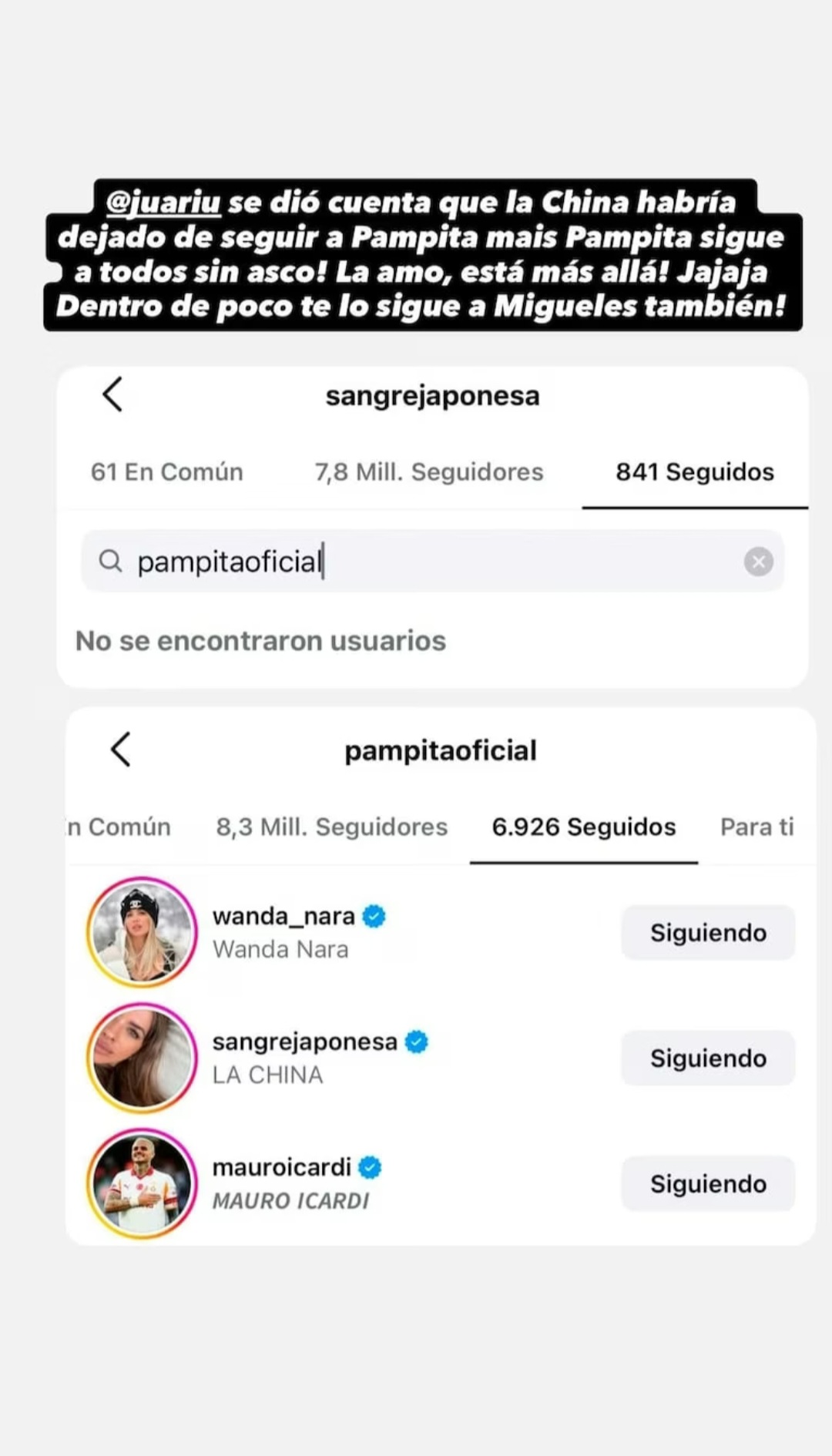 Vicky Braier más conocida como Juariu dio a conocer el movimiento digital que hizo la China Suárez en su cuenta de Instagram. La actriz tomó la decisión de dejar de seguir a Pampita. El dato no tardó en viralizarse y esperaron la reacción de la modelo.