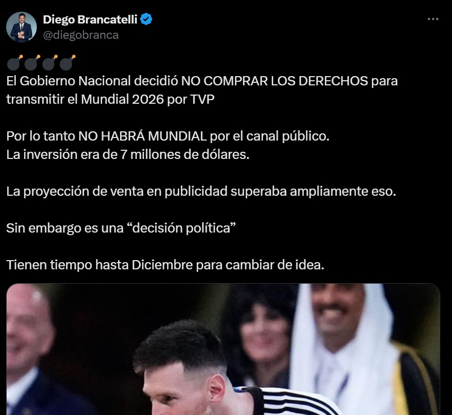 «No habrá mundial por el canal público. La inversión era de 7 millones de dólares. La proyección de venta en publicidad superaba ampliamente eso. Sin embargo es una ‘decisión política'», escribió el periodista. Además, agregó que se pueden retractar ya que tiene tiempo hasta diciembre.