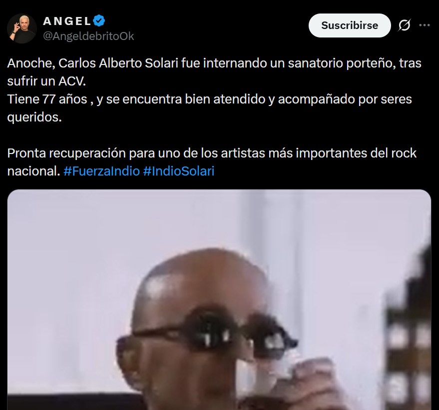 Ángel de Brito comunicó a sus seguidores de la red social X que el Indio Solari había sido internado en un sanatorio de Buenos Aires por un accidente cerebro vascular (ACV). La noticia generó preocupación en los fans del cantante. «Anoche, Carlos Alberto Solari fue internando un sanatorio porteño, tras sufrir un ACV. Tiene 77 años , y se encuentra bien atendido y acompañado por seres queridos», escribió el conductor de «LAM». «Pronta recuperación para uno de los artistas más importantes del rock nacional», agregó.