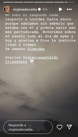 En redes sociales, otras exintegrantes del grupo también se expresaron. Virginia Da Cunha escribió: “Gracias a Dios la justicia llegó a tiempo. Te amamos, @lowrdez”. Por su parte, Valeria Gastaldi sumó un mensaje contundente: “Nunca es tarde para decir ‘ni una más’. Justicia, que dure”. Las muestras de apoyo se multiplican mientras Lourdes continúa recuperándose, rodeada de afecto y contención.