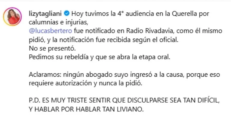 Con evidente molestia, la conductora compartió su descontento en redes sociales: “Hoy tuvimos la 4° audiencia en la querella por calumnias e injurias, Lucas Bertero fue notificado en Radio Rivadavia, como él mismo pidió, y la notificación fue recibida. No se presentó. Pedimos su rebeldía y que se abra la etapa oral”, explicó. Además, destacó la falta de representación legal del periodista: “Aclaramos que ningún abogado suyo ingresó a la causa, porque eso requiere autorización y nunca la pidió. Es muy triste ver que pedir disculpas resulta tan difícil y hablar por hablar, tan liviano.”