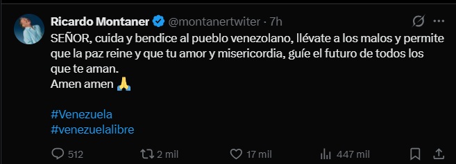 Uno de los primeros en manifestarse fue Ricardo Montaner, nacido en Argentina y criado en Venezuela, quien apeló a un mensaje espiritual a través de sus redes sociales: “Señor, cuida y bendice al pueblo venezolano, llévate a los malos y permite que la paz reine y que tu amor y misericordia guíe el futuro de todos los que te aman”.