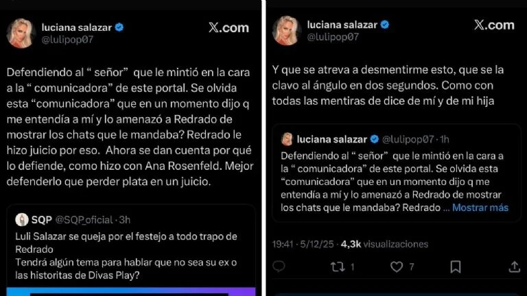 El ciclo televisivo mostró una story que Salazar había compartido en Instagram y lanzó un comentario filoso: “Luli Salazar se queja por el festejo a todo trapo de Redrado. ¿Tendrá algún tema para hablar que no sea su ex o las historitas de Divas Play?”. La frase no pasó inadvertida y provocó una respuesta contundente por parte de la mamá de Matilda. Desde su cuenta de X, apuntó directamente contra Yanina: “Defendiendo al ‘señor’ que le mintió en la cara a la ‘comunicadora’ de este portal”, recordó, repasando episodios previos entre Latorre y Redrado. Además agregó: “¿Se olvida esta ‘comunicadora’ que en un momento dijo que me entendía a mí y amenazó a Redrado de mostrar los chats que le mandaba?”.
