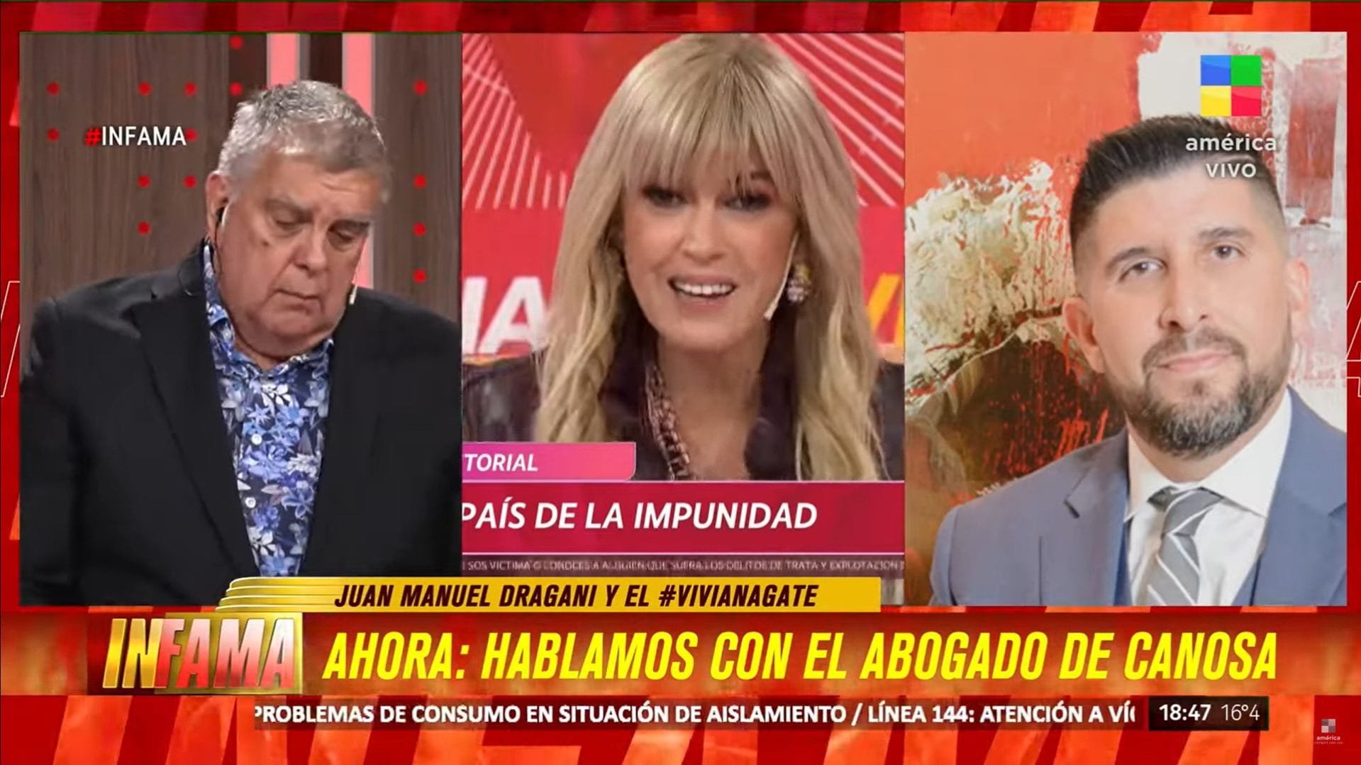 Este domingo Luis Ventura se sumó a «Infama» en la pantalla de América TV, y salió por teléfono Juan Manuel Dragani, el abogado de Viviana Canosa a horas de la ratificación de su denuncia. «Nunca podes decir nada vos, empeza a hablar. Sos el abogado, tenés que defenderla», mencionó el conductor de «Secretos verdaderos». Si bien Marcela Tauro medió, el letrado puntualizó: «Hay secreto de sumario. Mañana Viviana va a ratificar la denuncia y va a dar el paso procesal que tiene que dar».