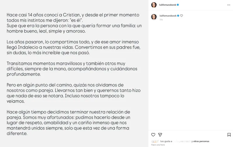 En un posteo de Instagram, la modelo confirmó la noticia de la ruptura del padre de su hijo Indalecio. «Hace casi 14 años conocí a Cristian y desde el primer momento todos mis instintos me dijeron: ‘es él’. Supe que era la persona con la que quería formar una familia: un hombre bueno, leal, simple y amoroso”, comenzó escribiendo la modelo.