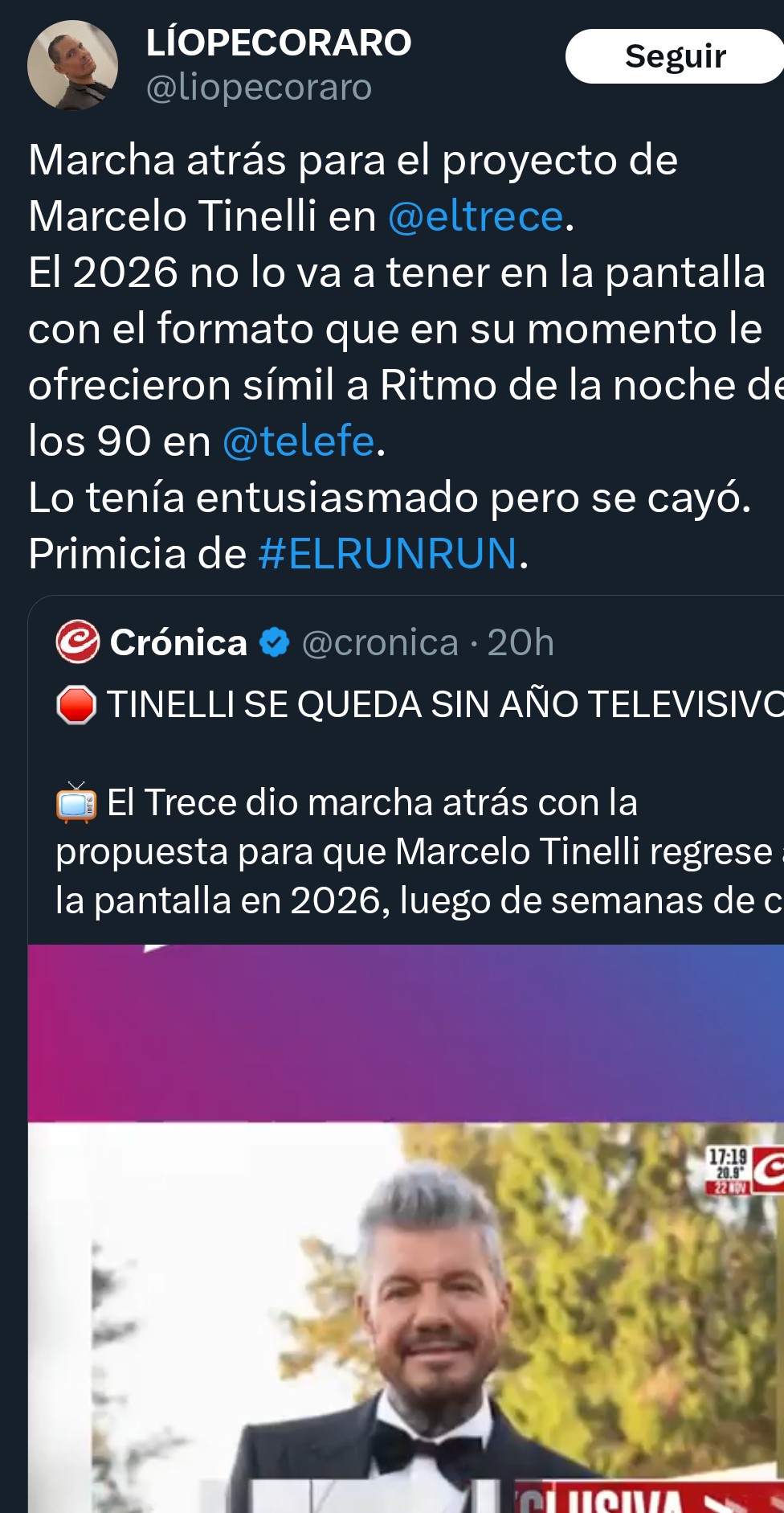 «Marcha atrás para el proyecto de Marcelo Tinelli en El Trece. El 2026 no lo va a tener en la pantalla con el formato que en su momento le ofrecieron símil a Ritmo de la noche de los 90 en Telefe Lo tenía entusiasmado pero se cayó, escribió Lío Pecoraro en su cuenta de X.