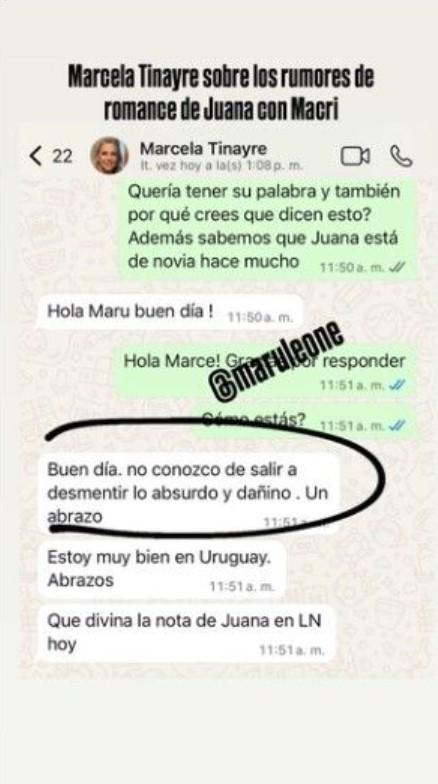 Fue la periodista Maribel Leone quién decidió consultarle a la conductora obre las versiones de una relación entre su hija y el exmandatario, y ella lanzó: «Buen día. No conozco de salir a desmentir lo absurdo y dañino. Un abrazo».