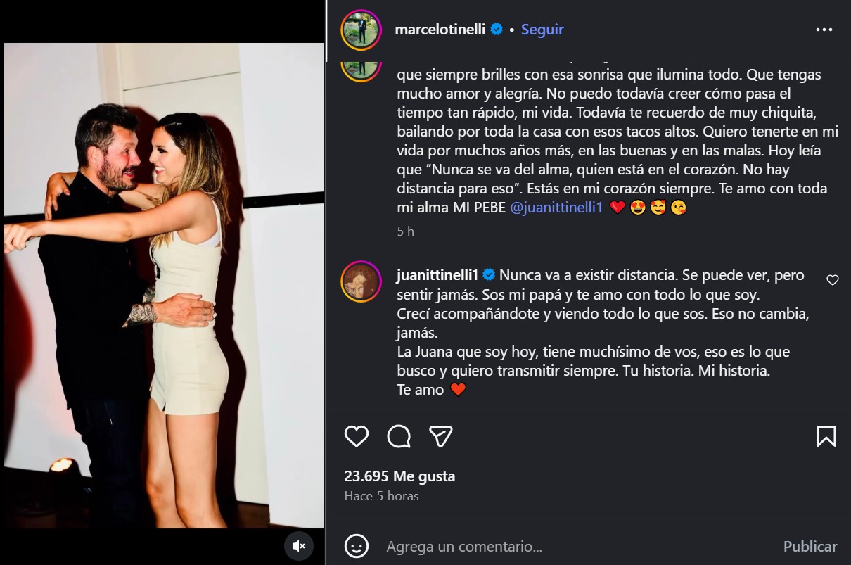 Juana Tinelli cumplió 23 años y Marcelo Tinelli le dedicó una publicación en su cuenta de Instagram con unas emotivas palabras. Para sorpresa de muchos, la modelo le respondió el posteo y cerró la grieta familiar por su denuncia por amenazas.