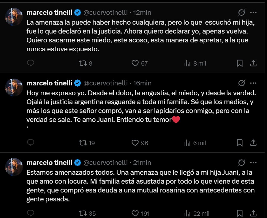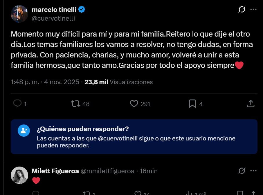 Sin embargo, el empresario aseguró que se habrían hecho pasar por él y dejó todo en manos de sus abogados. A raíz del escándalo que se generó, Marcelo Tinelli rompió el silencio en su cuenta de X y contó como está atravesando este momento a nivel familiar.