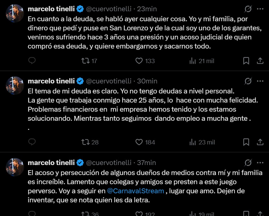 Asimismo, dejó que a nivel personal no tiene «ninguna deuda», pero que la empresa tiene «algunos problemas financieros» que están tratando de resolver. «En cuanto a la deuda, se habló ayer cualquier cosa. Yo y mi familia, por dinero que pedí y puse en San Lorenzo y de la cual soy uno de los garantes, venimos sufriendo hace 3 años una presión y un acoso judicial de quien compró esa deuda, y quiere embargarnos y sacarnos todo», escribió el conductor.
