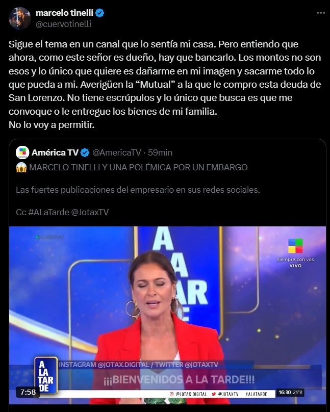«Sigue el tema en un canal que lo sentía mi casa. Pero entiendo que ahora, como este señor es dueño, hay que bancarlo. Los montos no son esos y lo único que quiere es dañarme en mi imagen y sacarme todo lo que pueda a mi. Averigüen la “Mutual” a la que le compro esta deuda de San Lorenzo. No tiene escrúpulos y lo único que busca es que me convoque o le entregue los bienes de mi familia. No lo voy a permitir«, escribió en X.