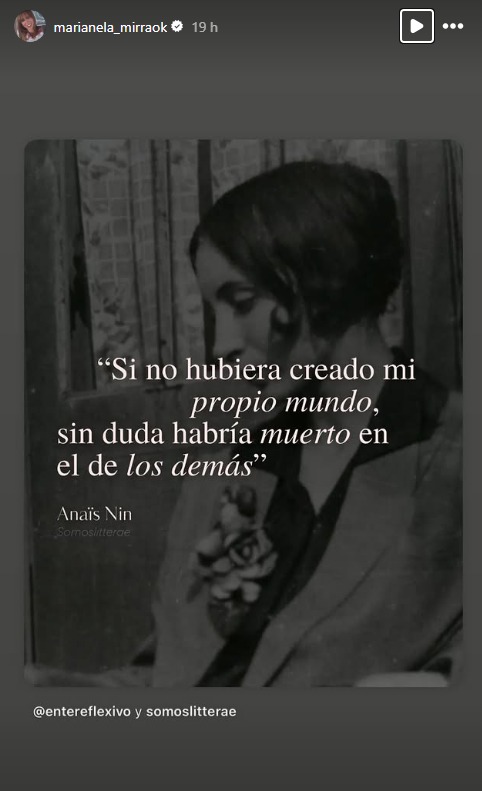 Al mismo tiempo, en sus redes sociales, Marianela compartió una imagen con la frase: «Si no hubiera creado mi propio mundo, sin duda habría muerto en el de los demás«, reafirmando su decisión de proteger su vida privada y su independencia frente a los rumores.