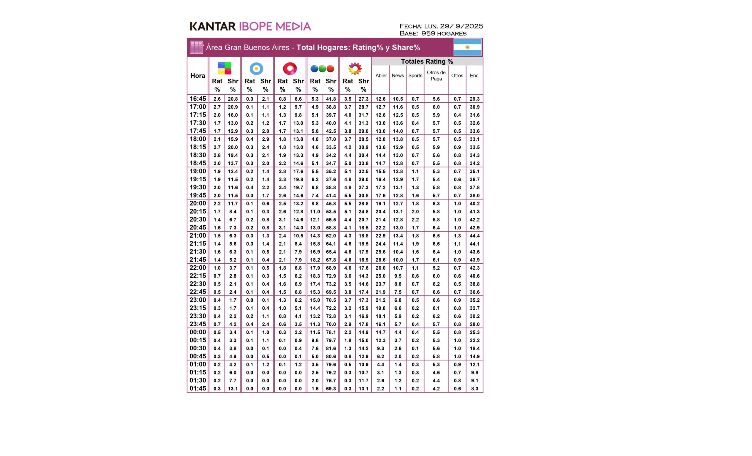 La previa arrancó a las 17 con Pía Shaw y Sofi Martínez al frente, logrando un piso de 4,9 puntos y un pico de 5,3. Luego, la alfombra roja, conducida por figuras como Iván de Pineda, Zaira Nara y Sol Pérez, impulsó la audiencia hasta los 14 puntos cerca de las 21, reflejando el interés del público por los looks y la llegada de los famosos. Ya a las 21:07, la ceremonia oficial comenzó con 13,1 puntos y rápidamente subió a 16,1 con las primeras estatuillas.
