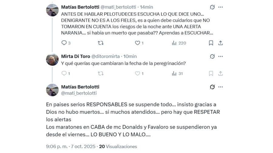Frente a las críticas, el meteorólogo decidió aclarar el sentido de su mensaje. En un posteo en la misma red social, escribió con tono firme: «Antes de hablar pelotu… escuchá lo que dice uno. Denigrante no es a los fieles, es a quien debe cuidarlos, que no tomaron en cuenta los riesgos de la noche ante una alerta naranja. ¿Si había un muerto qué pasaba?». De esa manera, Bertolotti explicó que su comentario apuntaba a la falta de medidas preventivas, y no a los creyentes que participaron de la caminata.