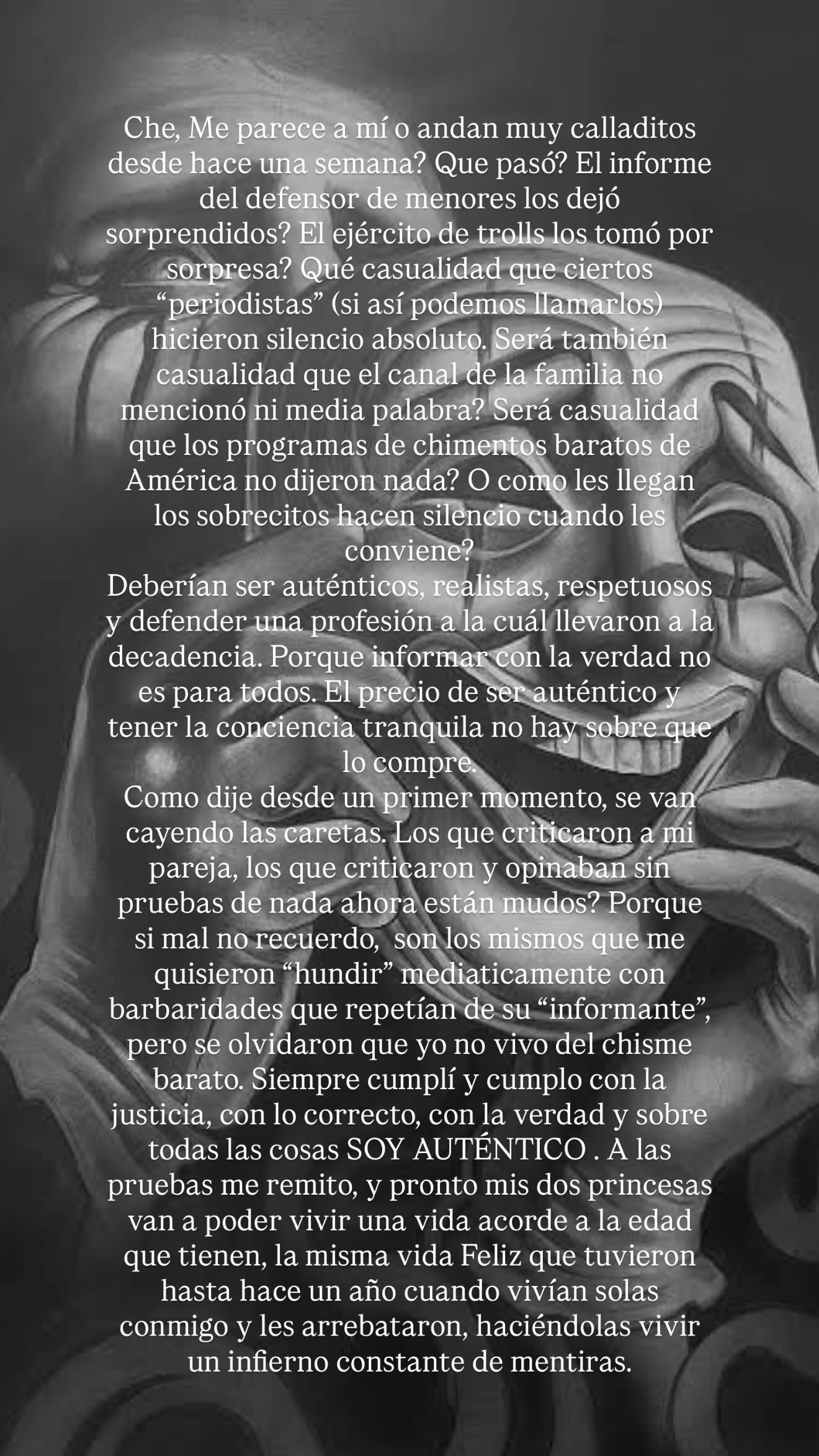 «Siempre cumplí y cumplo con la justicia, con lo correcto, con la verdad y sobre todas las cosas soy auténtico. A las pruebas me remito y pronto mis dos princesas van a poder vivir una vida acorde a la edad que tienen, la misma vida feliz que tuvieron hasta hace un año cuando vivían solas conmigo y les arrebataron, haciéndolas vivir un infierno constante de mentiras», finalizó.