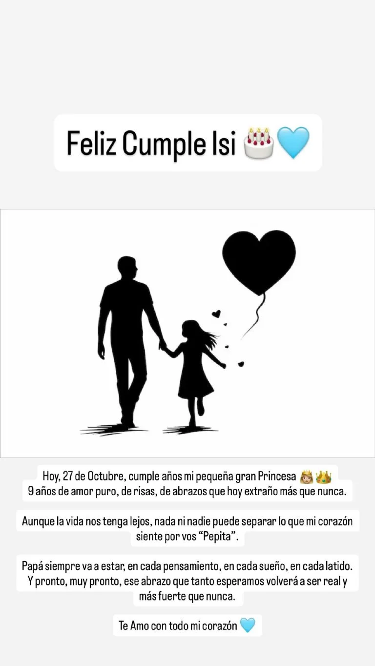 Desde su cuenta de Instagram, el rosarino le dejó un tierno mensaje en esta fecha tan especial. «Feliz Cumple Isi. Hoy, 27 de Octubre, cumple años mi pequeña gran Princesa. Son 9 años de amor puro, de risas, de abrazos que hoy extraño más que nunca. Aunque la vida nos tenga lejos, nada ni nadie puede separar lo que mi corazón siente por vos Pepita».