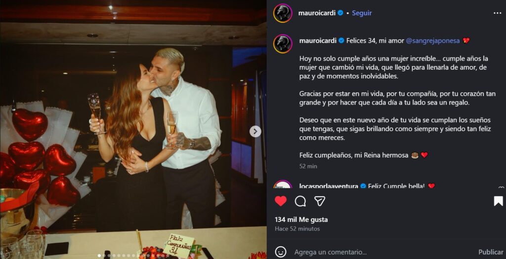 Luego de la celebración, el jugador del Galatasaray utilizó su cuenta de Instagram para dedicarle un extenso posteo a la actriz por su día. «Felices 34, mi amor», comienza el escrito arrobando a Eugenia seguido de un corazón rojo.