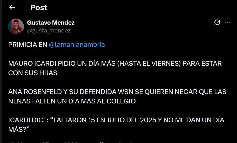 “Ana Rosenfeld y su defendida WSN se quieren negar que las nenas falten un día más al colegio. Icardi dice ‘faltaron 15 de julio del 2025 y no me dan un día más?’“, agregó Méndez. En las próximas horas se resolverá que pasará con el pedido de Mauro Icardi.