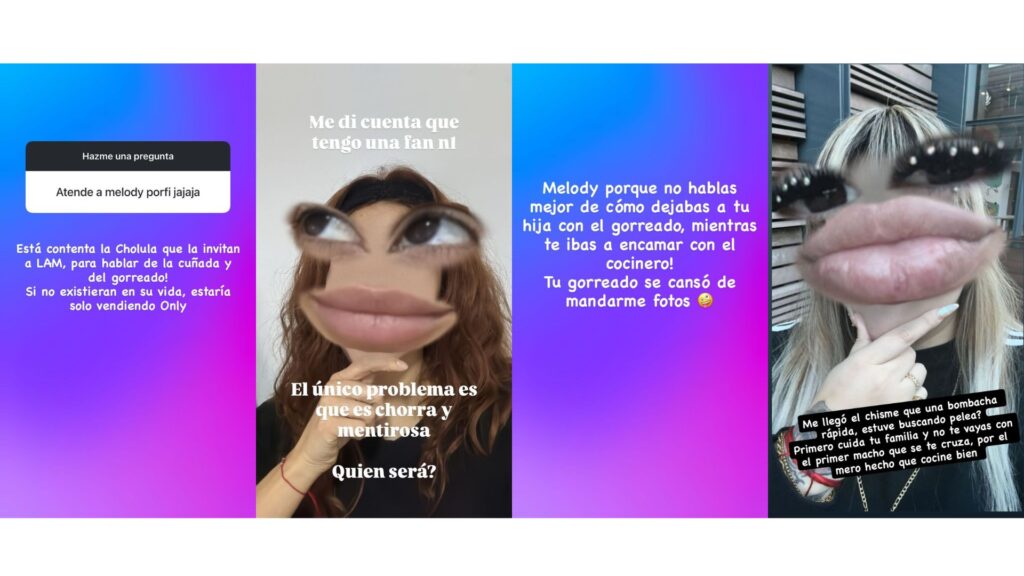La bailarina recogió el guante y le respondió con ironía: “Me di cuenta que tengo una fan número 1. El único problema es que es chorra y mentirosa ¿Quién será?”. La contraofensiva de Morena no tardó: “Primero cuidá tu familia y no te vayas con el primer macho que se te cruza, por el mero hecho que cocine bien”, en referencia a la breve relación de Melody con el chef Santiago del Azar. Luego fue más lejos: “Melody, ¿por qué no hablás mejor de cómo dejabas a tu hija con el gorreado mientras te ibas a encamar con el cocinero? Tu gorreado se cansó de mandarme fotos”.