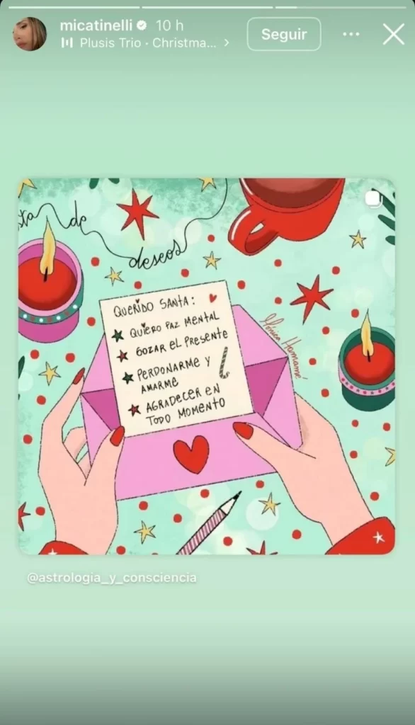 En la publicación, Mica mostró una ilustración de una carta dirigida a Papá Noel con un pedido cargado de significado personal. Allí se lee textualmente: «Querido Santa: Quiero paz mental, gozar el presente, perdonarme y amarme y agradecer en todo momento». El mensaje fue interpretado como una clara señal de autocuidado y sanación, luego de meses difíciles tanto en el plano familiar como sentimental.