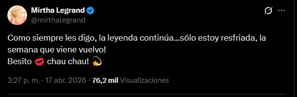 “Como siempre les digo, la leyenda continúa… sólo estoy resfriada, ¡la semana que viene vuelvo!”, escribió la legendaria conductora pasadas las tres de la tarde. De esta manera, confirmó que su ausencia será estrictamente temporal y que se encuentra haciendo el reposo correspondiente en su domicilio para recuperarse al cien por ciento.