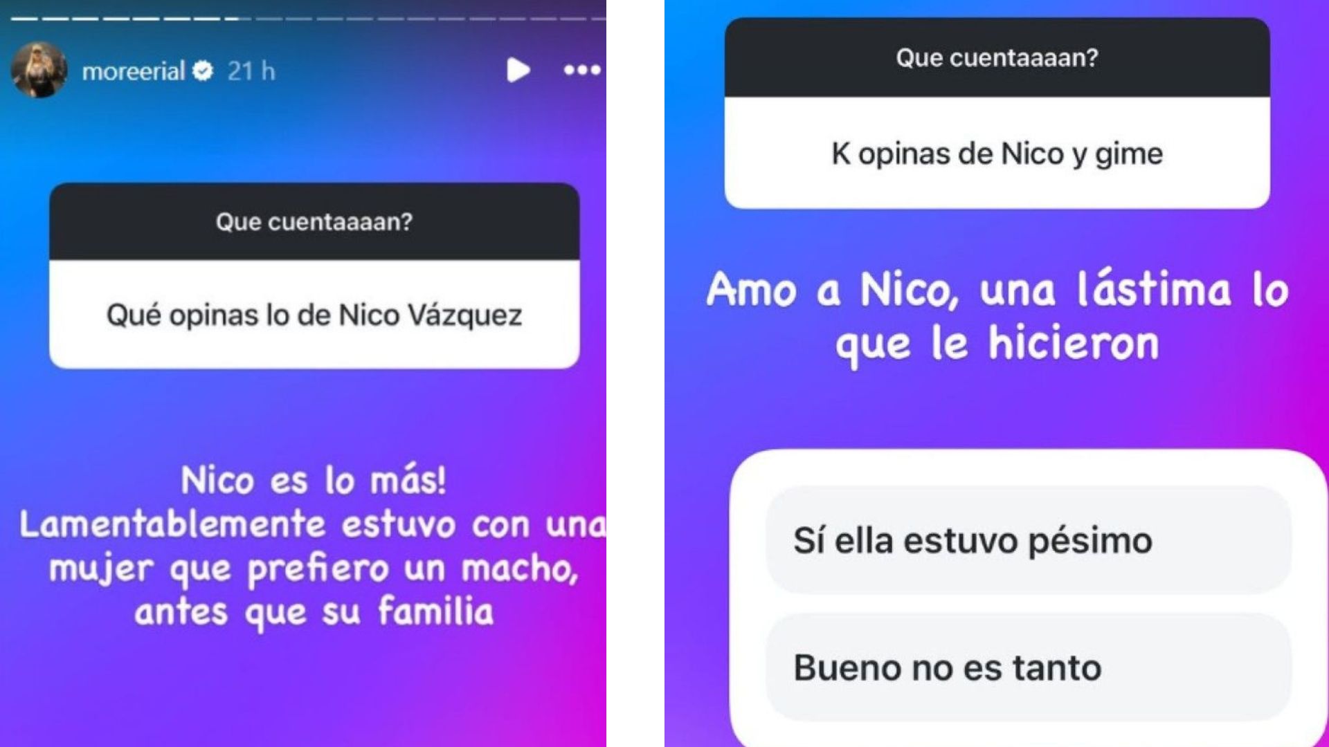 «Nico es lo más. Lamentablemente estuvo con una mujer que prefirió un macho antes que su familia» escribió la influencer sobre la separación de los actores luego de 18 años de amor en la cajita de preguntas de las historias de Instagram.