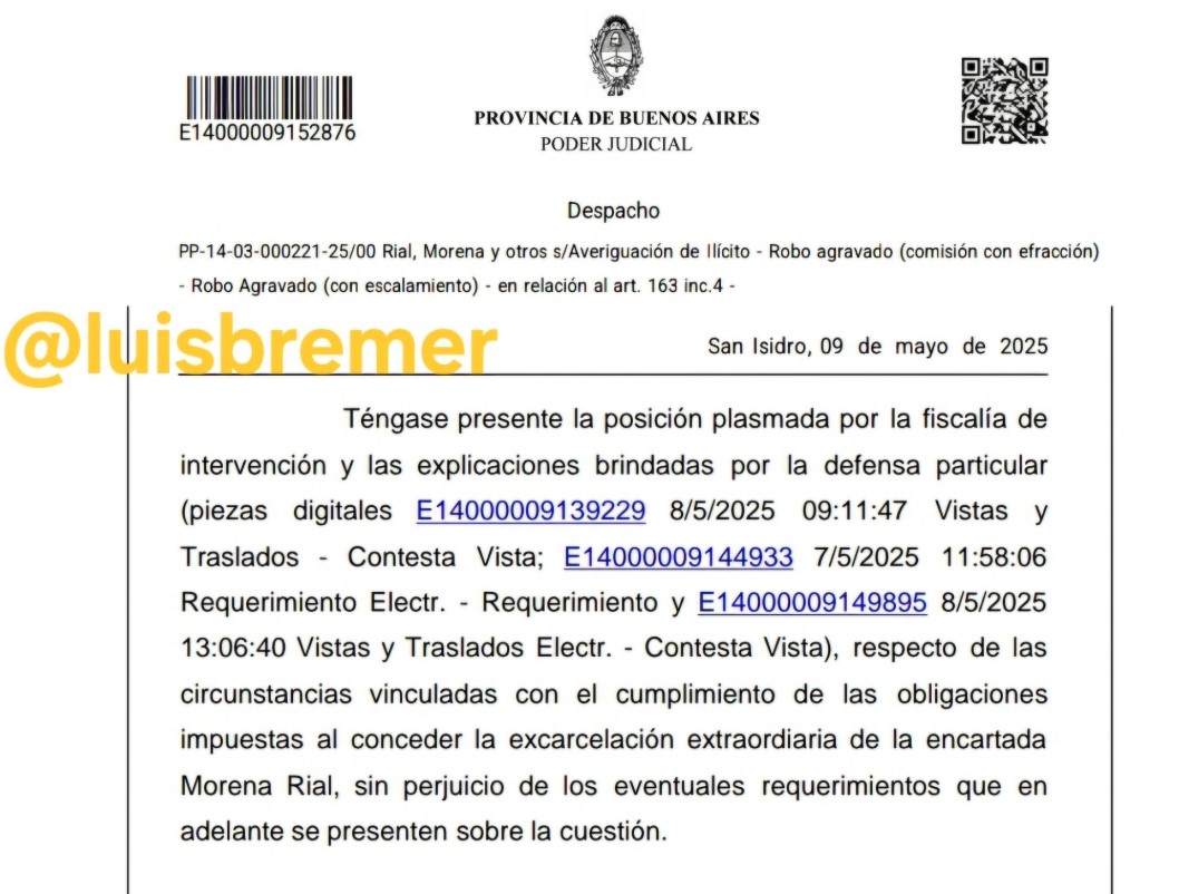 En las últimas horas, el periodista Luis Bremer compartió la noticia en su cuenta de X de que finalmente Morena Rial quedó libre. «Respecto a las circunstancias vinculadas con el cumplimiento de las obligaciones impuestas al conceder la excarcelación extraordinaria de la encartada Morena Rial, sin perjuicio de los eventuales requerimientos que en adelante se presenten sobre la cuestión».