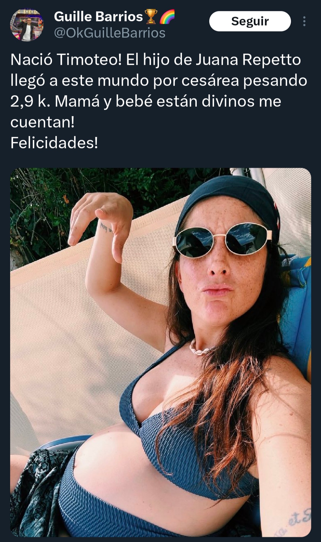 Guillermo Barrios, fue el encargado de brindar esta información. «¡Nació Timoteo! El hijo de Juana Repetto llegó a este mundo por cesarea pesando 2.9k. Mamá y bebé están divinos me cuentan. Felicidades» escribió el periodista en su cuenta de X.
