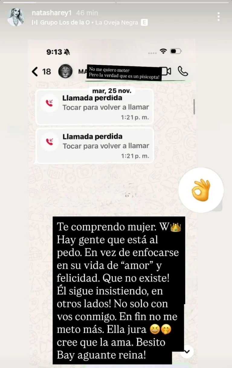 En ese contexto, Natasha Rey rompió el silencio y filtró capturas de pantalla donde se observan llamadas perdidas que Mauro Icardi le habría realizado en noviembre de 2025. Acompañando las imágenes, lanzó una fuerte declaración: «No me quiero meter, pero la verdad que es un psicópata». Además, aseguró que el futbolista mantiene contactos paralelos: «Él sigue insistiendo en otros lados. No solo con vos (Wanda), también conmigo. En fin, no me meto más».