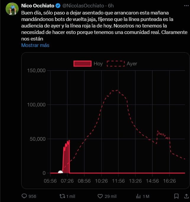 Este miércoles, Occhiato agregó: «Buen día, sólo paso a dejar asentado que arrancaron esta mañana mandándonos bots de vuelta jaja, fíjense que la línea punteada es la audiencia de ayer y la línea roja la de hoy. Nosotros no tenemos la necesidad de hacer esto porque tenemos una comunidad real. Claramente nos están queriendo ensuciar«.