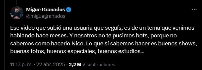 El cruce entre Nico Occhiato y Migue Granados empezó ayer en X cuando el dueño de LUZU TV enfatizó: «A esta hora solemos tener siempre 15.000 menos de audiencia.Nos mandaron bots y esta cuenta sube esto a los dos minutos, muy raro todo… nosotros no estamos compitiendo con nadie, no nos interesa ganarle a nadie ni andamos alardeando números. Solo tratamos de hacer el mejor contenido posible para nuestra comunidad. Sinceramente, me da mucha impotencia que pase esto y trato de no meterme, ni contestar, ni nada, pero acá me está ganando la emoción y quiero dejarlo asentado para que no hablen boludeces«.