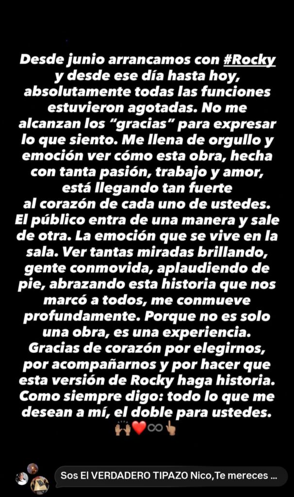«Desde junio arrancamos con ‘Rocky’ y desde ese día hasta hoy, absolutamente todas las funciones estuvieron agotadas», comenzó escribiendo el actor.