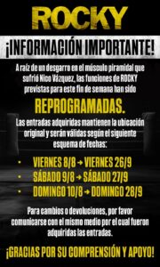 A través de un comunicado difundido en las redes sociales oficiales de la obra de teatro Rocky, se confirmó que el actor Nico Vázquez sufrió un desgarro en el músculo piramidal, lo que obliga a suspender las presentaciones programadas para este fin de semana. La producción informó que las funciones serán reprogramadas para nuevas fechas, respetando la ubicación y validez de las entradas ya adquiridas.