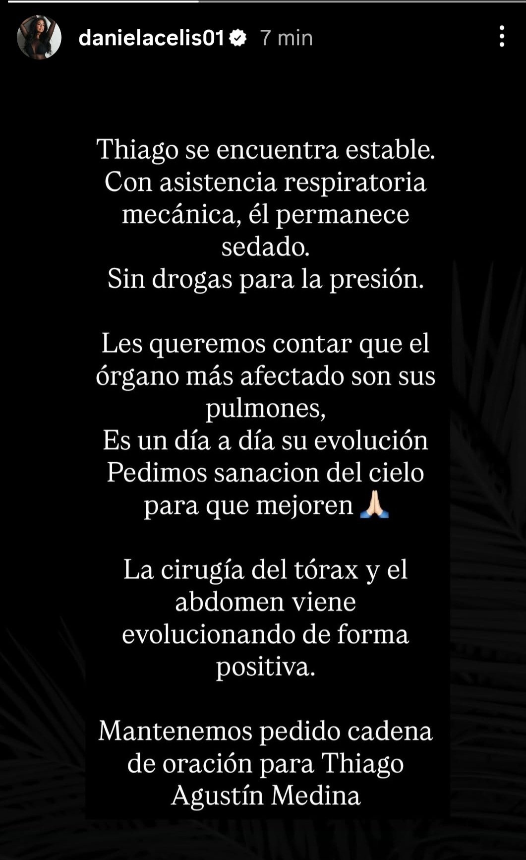 Su exmujer agregó: «Les queremos contar que el órgano más afectado son sus pulmones. Es un día a día su evolución. Pedimos sanación del cielo para que mejoren… La cirugía del tórax y el abdomen viene evolucionando de forma positiva. Mantenemos pedido cadena de oración para Thiago Agustín Medina«.