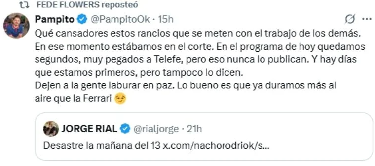 Lejos de quedarse callado, el panelista utilizó la misma red social y escribió: «Qué cansadores estos rancios que se meten con el trabajo de los demás. En ese momento estábamos en el corte. En el programa de hoy quedamos segundos, muy pegados a Telefe, pero eso nunca lo publican. Y hay días que estamos primeros, pero tampoco lo dicen». «Dejen a la gente laburar en paz. Lo bueno es que ya duramos más al aire que la Ferrari», agregó con un palito directo al conductor de «Argenzuela».