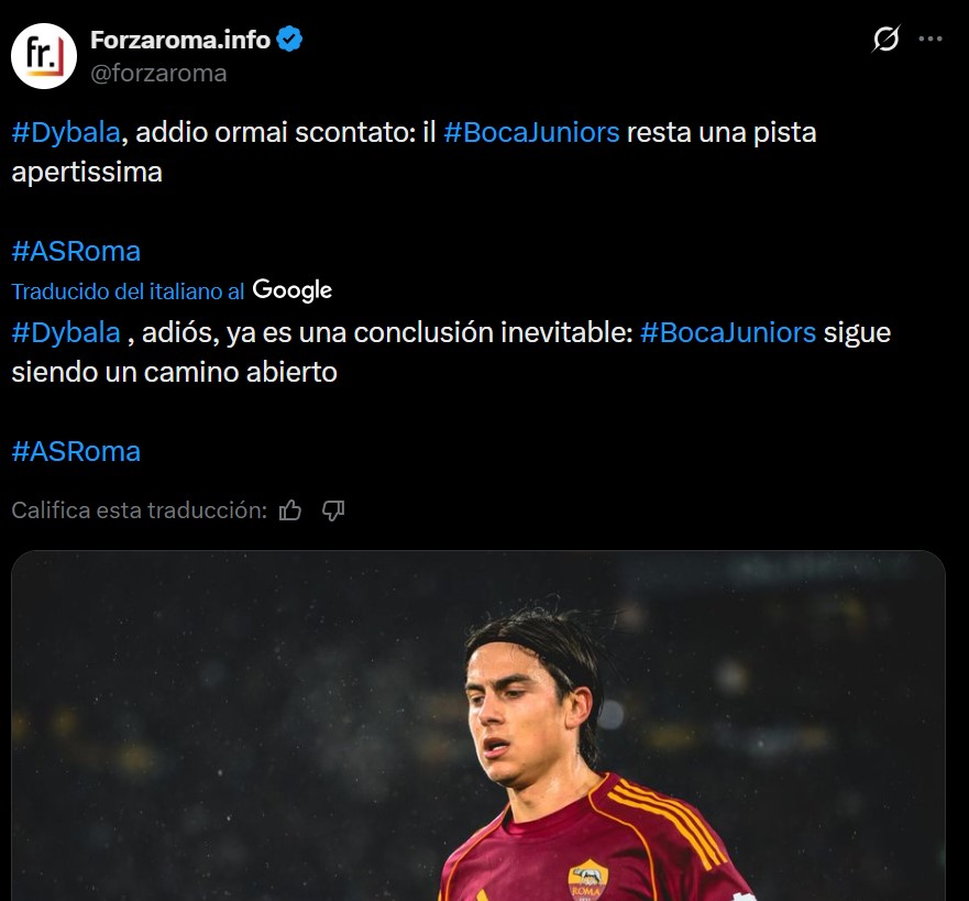 Según la cuenta de X @forzaroma.info la salida del delantero es inminente. «#Dybala , adiós, ya es una conclusión inevitable», escribieron en el perfil. Y agregaron: «: #BocaJuniors sigue siendo un camino abierto», dejando entrever el posible destino.